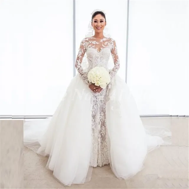 Long Sleeve Lace Mermaid Wedding Dresses With Detachable